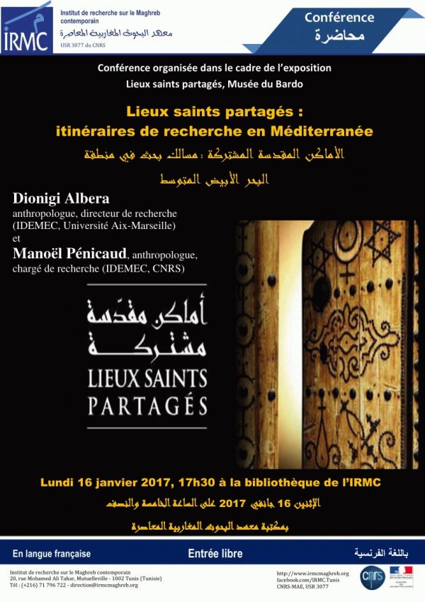 Lieux saints partagés [attachments] / TUNISIE. Institut de recherche sur le Maghreb contemporain - IRMC (Tunis) : itinéraires de recherche en Méditerranée : Conférence : 16/01/2017 = الأماكن المقدسة المشتركة : مسالك بحث في منطقة البحر الأبيض المتوسط