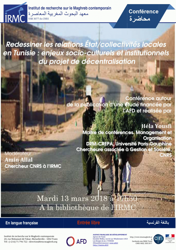 Redessiner les relations État/collectivités locales en Tunisie [attachments] : enjeux socio-culturels et institutionnels du projet de décentralisation : Conférence : 2018-03-13