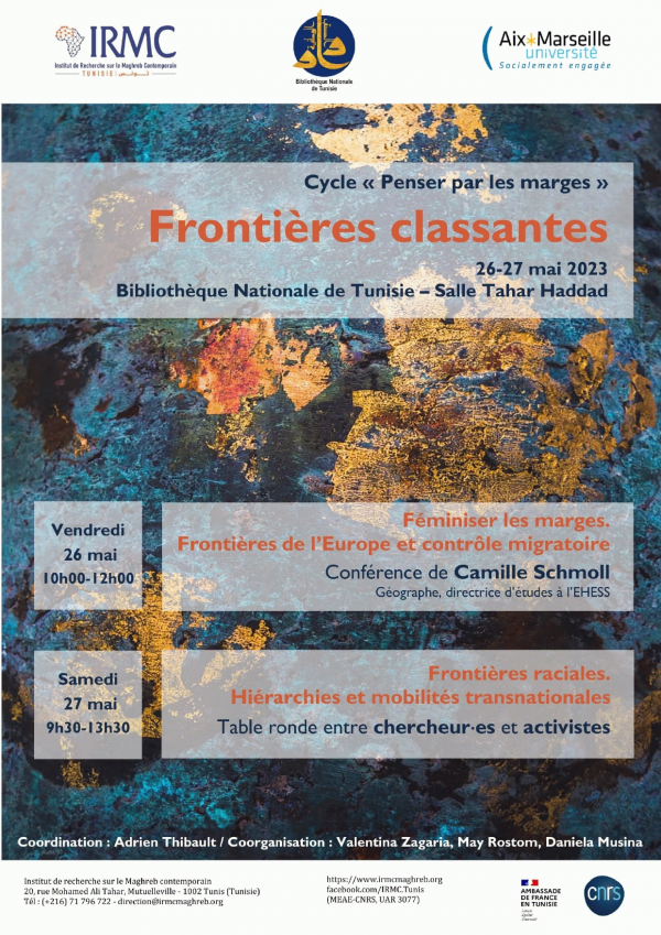 Frontières classantes [attachments] : 26-27 mai 2023 : Conférence de Camille Schmoll"Féminiser les marges. Frontières de l'Europe et contrôle migratoire"/ : table ronde entre chercheures"Frontières raciales. Hiérarchies et mobilités transnationales" Publication: Tunis : IRMC, 2023Description: 1 aff. :