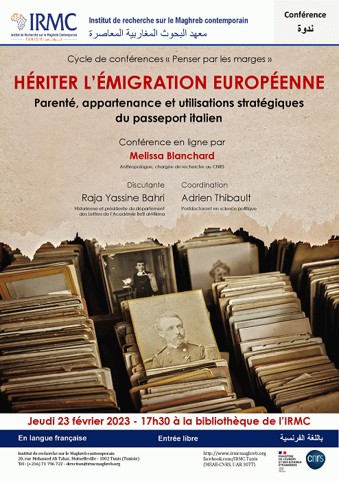 Hériter , l'émigration européenne [attachments] : conférence 23-02-2023 : parenté, appartenance et utilisations stratégiques du passeport italien Publication: Tunis : IRMC, 2023Description: 1 aff. :