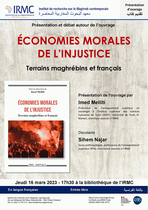 Économies morales de l'injustice [attachments] : présentation et débat 16-03-2023 : terrains magrébins et Français Publication: Tunis : IRMC, 2023Description: 1 aff. :