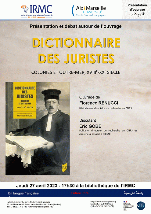 Dictionnaire des juristes [attachments] : présentation d'ouvrage 27-04-2023 : colonies et Outre-Mer : XVIIIe-XXe siècle Publication: Tunis : IRMC, 2023Description: 1 aff. :