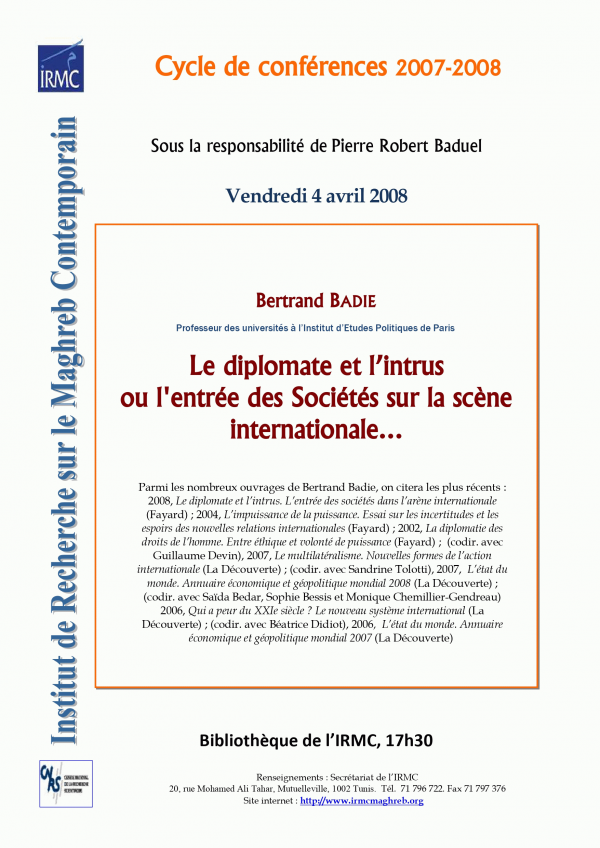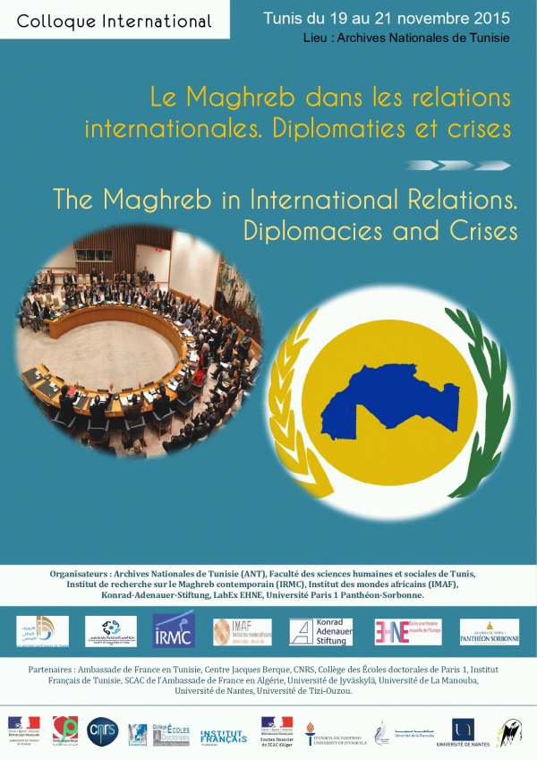 Le Maghreb dans les relations internationales [attachments] : diplomaties et crises : Colloque international : 2015-11-19 = The Maghreb in International Relations : diplomaties and Crises (Tunis du 19 au 21 novembre 2015) Publication: Tunis : IRMC, 2015Description: 1 aff. :