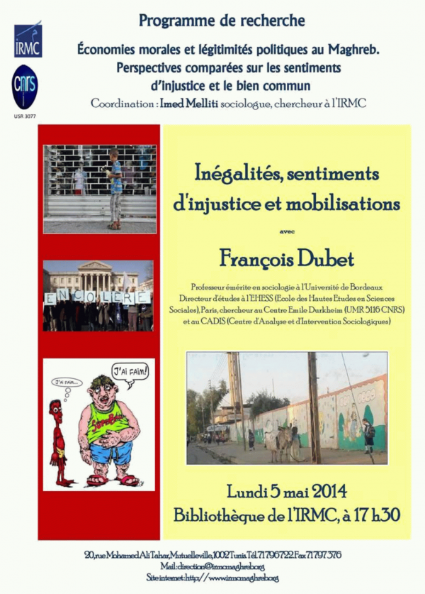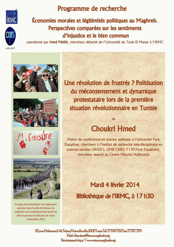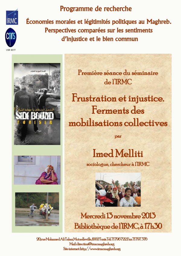 Frustration et injustice [attachments] : ferments des mobilisations collectives : première séance du séminaire de l’IRMC : Conférence : 2013-11-13 Publication: Tunis : IRMC, 2013Description: 1 aff. :