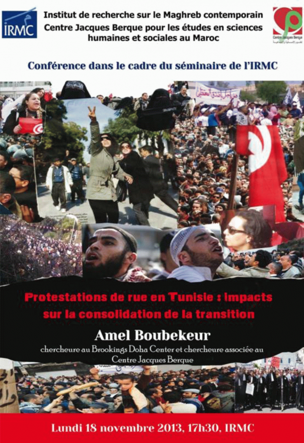 Protestations de rue en Tunisie [attachments] : impact sur la consolidation de la transition : Conférence : 2013-11-18 Publication: Tunis : IRMC, CJB, 2013Description: 1 aff. :