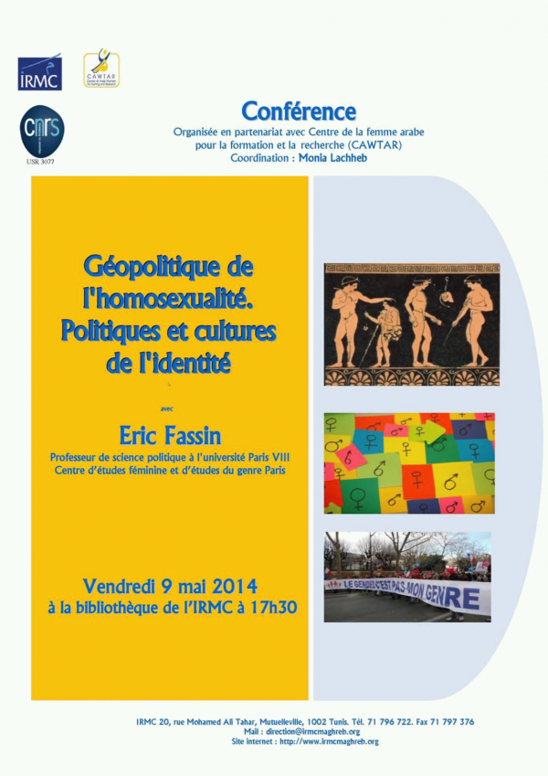 Géopolitique de l'homosexualité [attachments] : politiques et cultures de l'identité : Conférence : 2014-05-09 Publication: Tunis : IRMC, CAWTAR, 2014Description: 1 aff. :