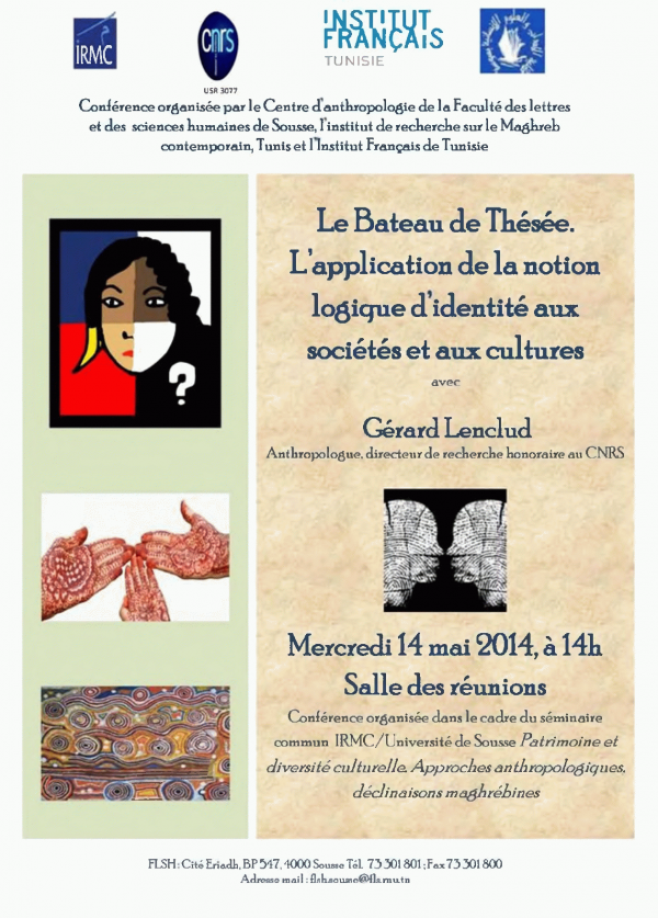 Le Bateau de Thésée [attachments] : l’application de la notion logique d identité aux sociétés et aux cultures : Conférence : 2014-05-14 Publication: Tunis : Sousse : IRMC, IFT, FLSHS, 2014Description: 1 aff. :