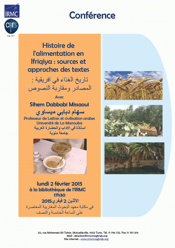 Histoire de l'alimentation en Ifriqiya [attachments] : sources et approches des textes : Conférence : 2015-02-02 = تاريخ الغذاء في افريقية : المصادر و مقاربة النصوص Publication: Tunis : IRMC, 2015Description: 1 aff. :