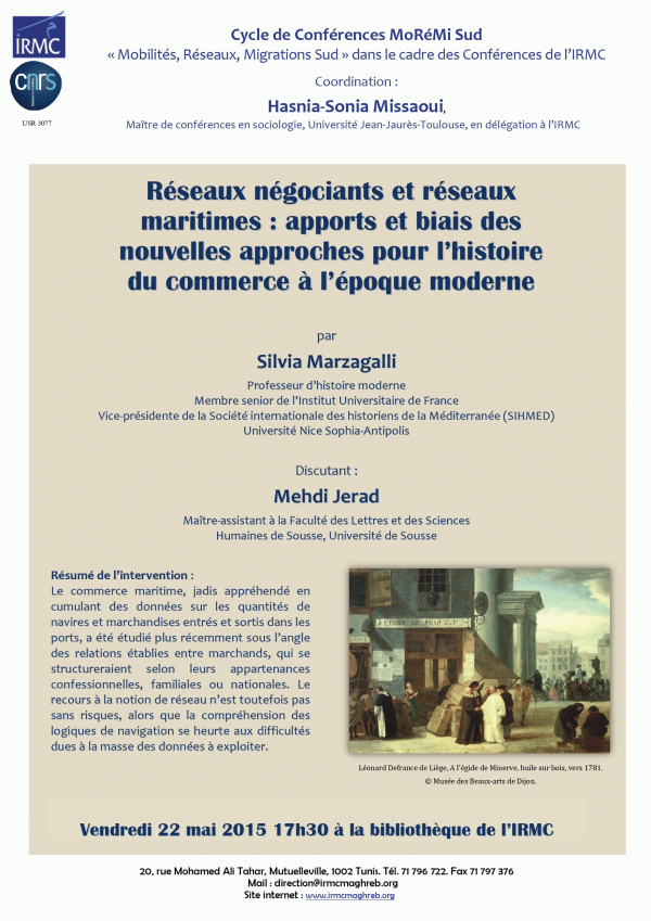 Réseaux négociants et réseaux maritimes [attachments] : apports et biais des nouvelles approches pour l’histoire du commerce à l’époque moderne : Conférence : 2015-05-22 Publication: Tunis : IRMC, 2015Description: 1 aff. :