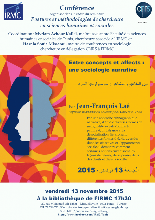 Entre concepts et affects [attachments] : une sociologie narrative : Conférence : 2015-11-13 = بين المفاهيم و المشاعر : سوسيولوجيا السرد Publication: Tunis : IRMC, 2015Description: 1 aff. :