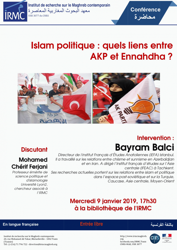 Islam politique [attachments] : quels liens entre AKP et Ennahdha ? : Conférence : 2019-01-09 Publication: Tunis : IRMC, 2019Description: 1 aff. :