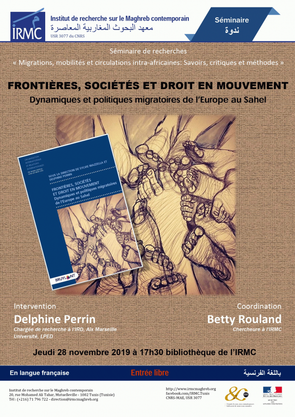 Frontières, sociétés et droit en mouvement [attachments] : dynamiques et politiques migratoires de l’Europe au Sahel : Séminaire : 2019-11-28 = الحدود، المجتمعات والحق في التنقل والحركة : ديناميكيات وسياسات الهجرة من أوروبا إلى بلدان الساحل Publication: Tunis : IRMC, 2019Description: 1 aff. :