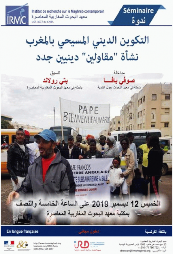 Formation religieuse chrétienne au Maroc [attachments] : la naissance de nouveaux entrepreneurs religieux : Séminaire : 2019-12-12 = التكوين الديني المسيحي بالمغرب : نشأة "مقاولين" دينيين جدد Publication: Tunis : IRMC, 2019Description: 1 aff. :